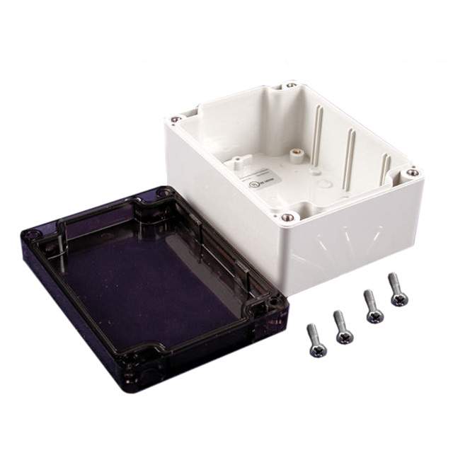 Features Card Guides, PCB Supports, Watertight Detailed Description Box Plastic, Polycarbonate Gray, Smoke Cover/Door Cover Included 4.724" L x 3.543" W (120.00mm x 89.99mm) X 2.362" (60.00mm)