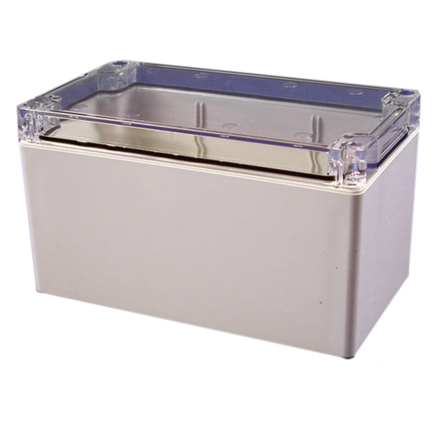 Features Card Guides, PCB Supports, Watertight Detailed Description Box Plastic, Polycarbonate Gray, Clear Cover/Door Cover Included 6.299" L x 3.543" W (159.99mm x 89.99mm) X 3.543" (90.00mm)